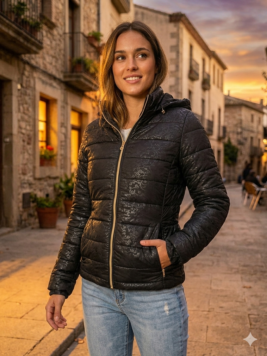 Campera Nina Floral Night: Esta campera combina la funcionalidad de un abrigo térmico con un toque sofisticado y femenino. Su diseño acolchado entallado ofrece una silueta moderna sin perder la comodidad.