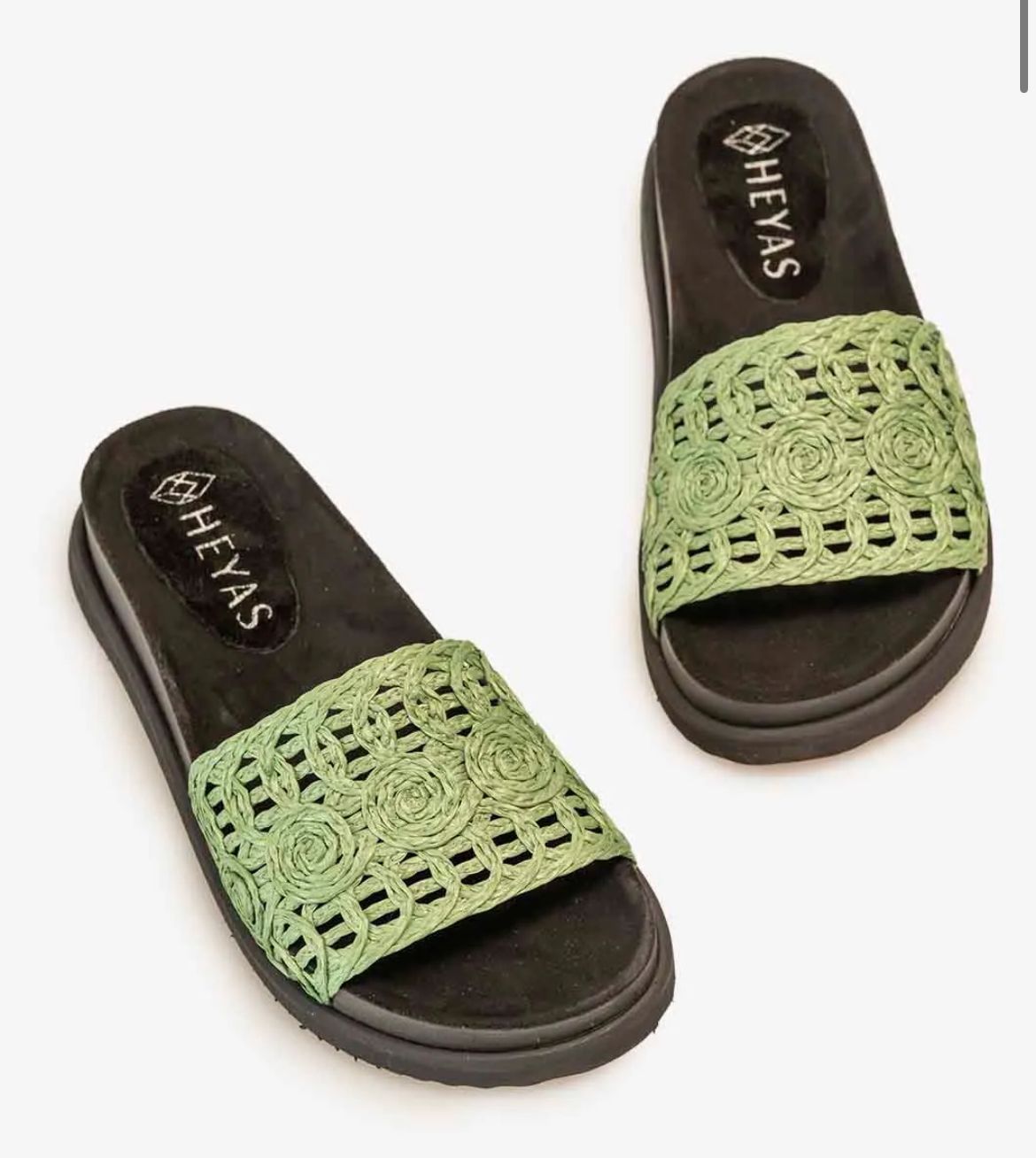 Sandalias estilo urbano con base negra de goma antideslizante que brinda comodidad y seguridad al caminar. Poseen capellada ancha en diseño tejido artesanal, disponible en colores amarillo y verde, que aporta frescura y un toque original al look.
