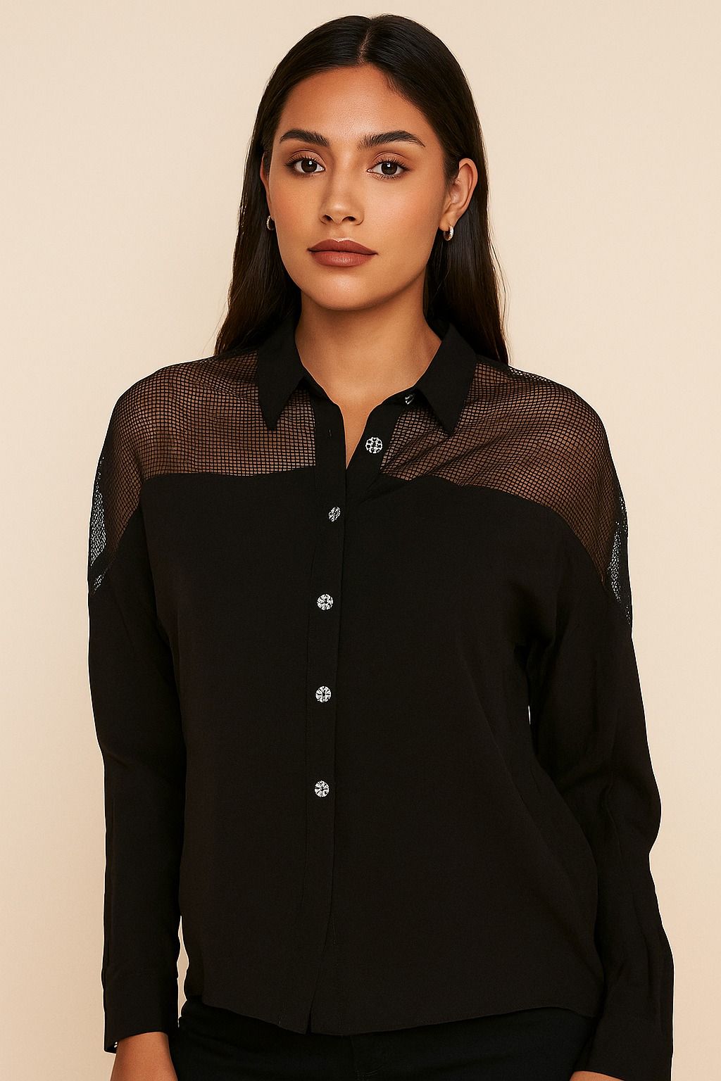 Elegante y moderna, esta camisa negra de manga larga destaca por su diseño sofisticado con detalle de red en la parte superior y los hombros, que aporta un toque sutil y femenino. Su corte recto y botones frontales decorativos realzan la silueta, convirtiéndola en una prenda versátil ideal para looks formales o casuales con estilo. Perfecta para combinar con pantalones sastreros o jeans y lograr un outfit chic sin esfuerzo.