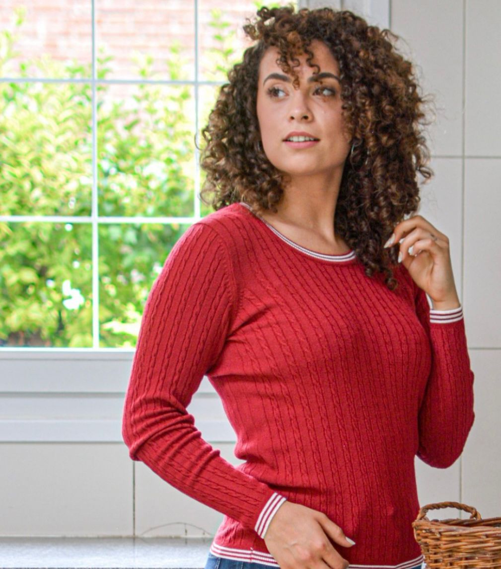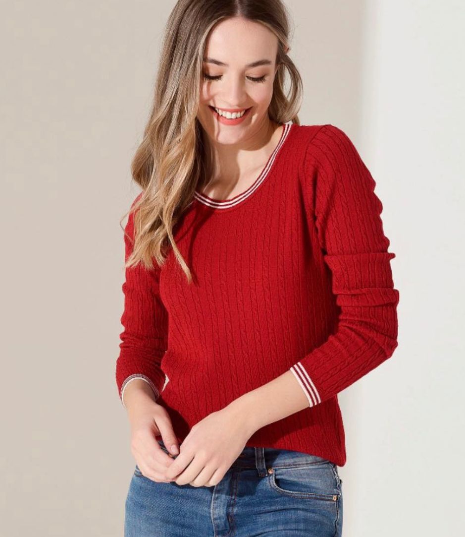 Sweater tejido con diseño en relieve, de corte recto y ajuste cómodo. Cuenta con cuello redondo, mangas largas y delicados detalles en contraste en el borde del escote, puños y ruedo, que le aportan un toque moderno y distintivo. Una prenda versátil, ideal para combinar tanto en looks casuales como más elegantes.