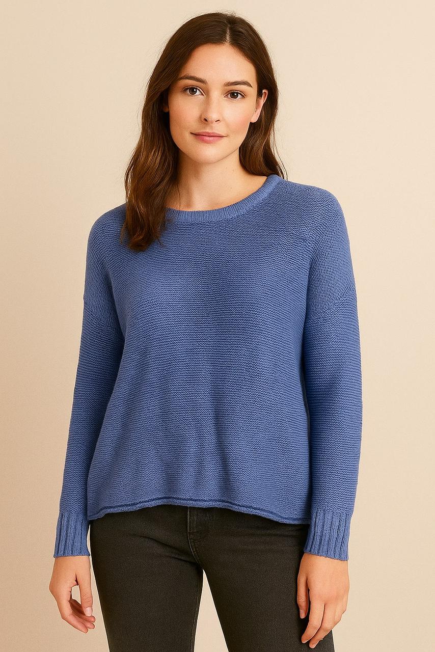 Sweater de punto en color azul medio, de diseño clásico y versátil. Presenta cuello redondo, mangas largas y terminaciones acanaladas en puños. Su tejido ligero y de textura suave lo convierte en una prenda cómoda e ideal para el uso diario, perfecta para combinar con jeans o pantalones de estilo casual.