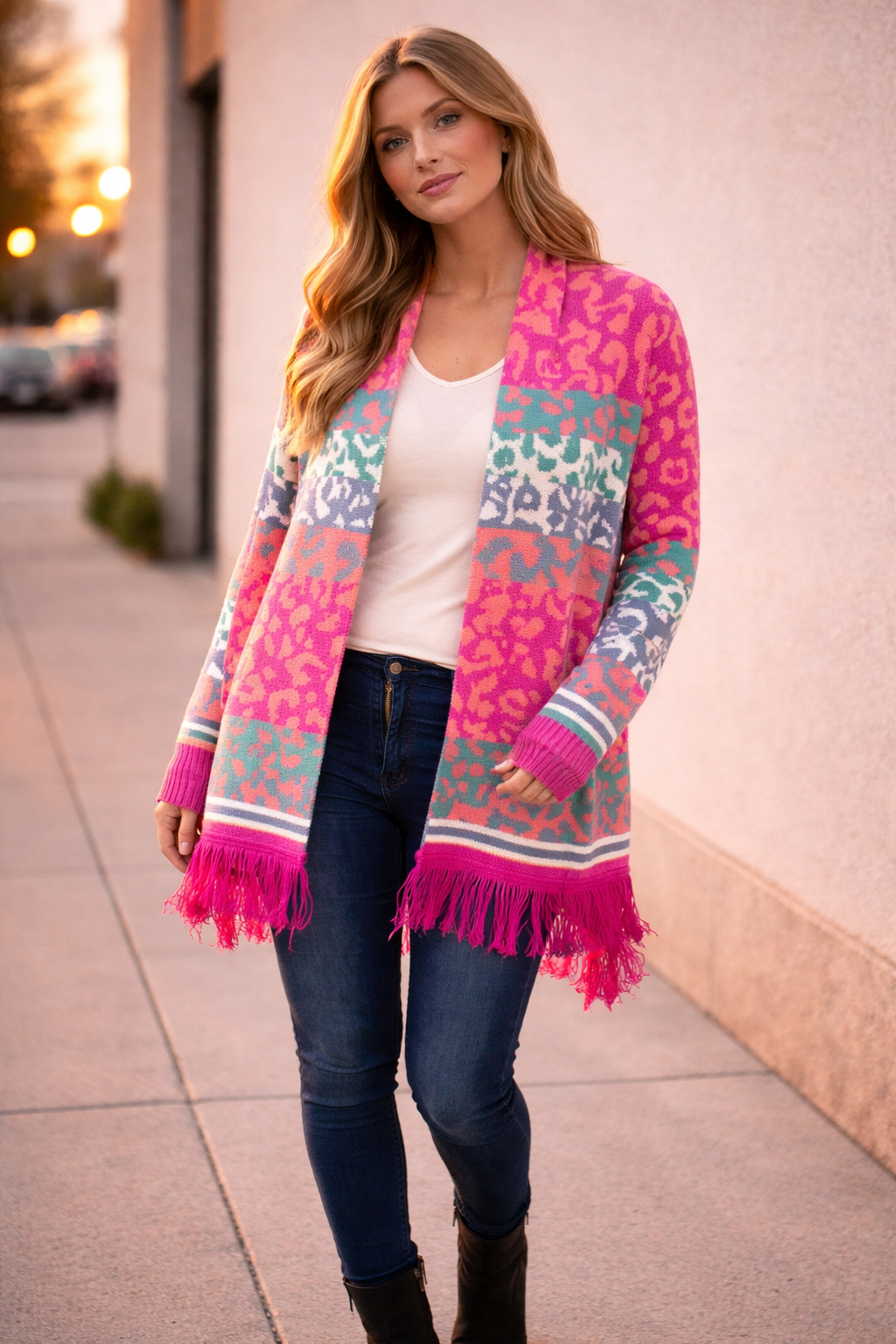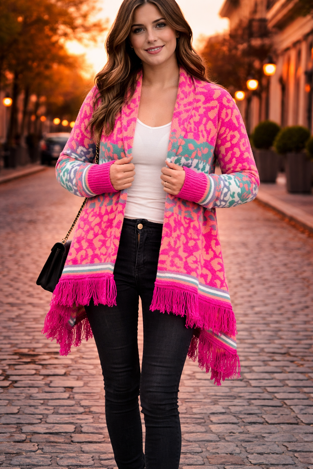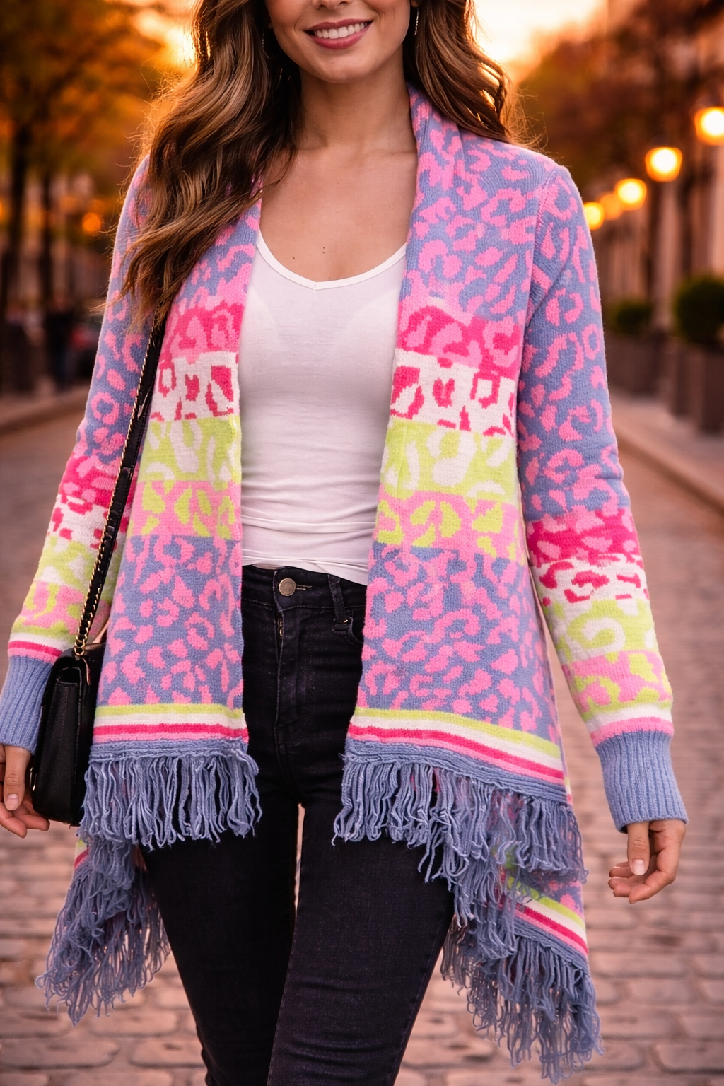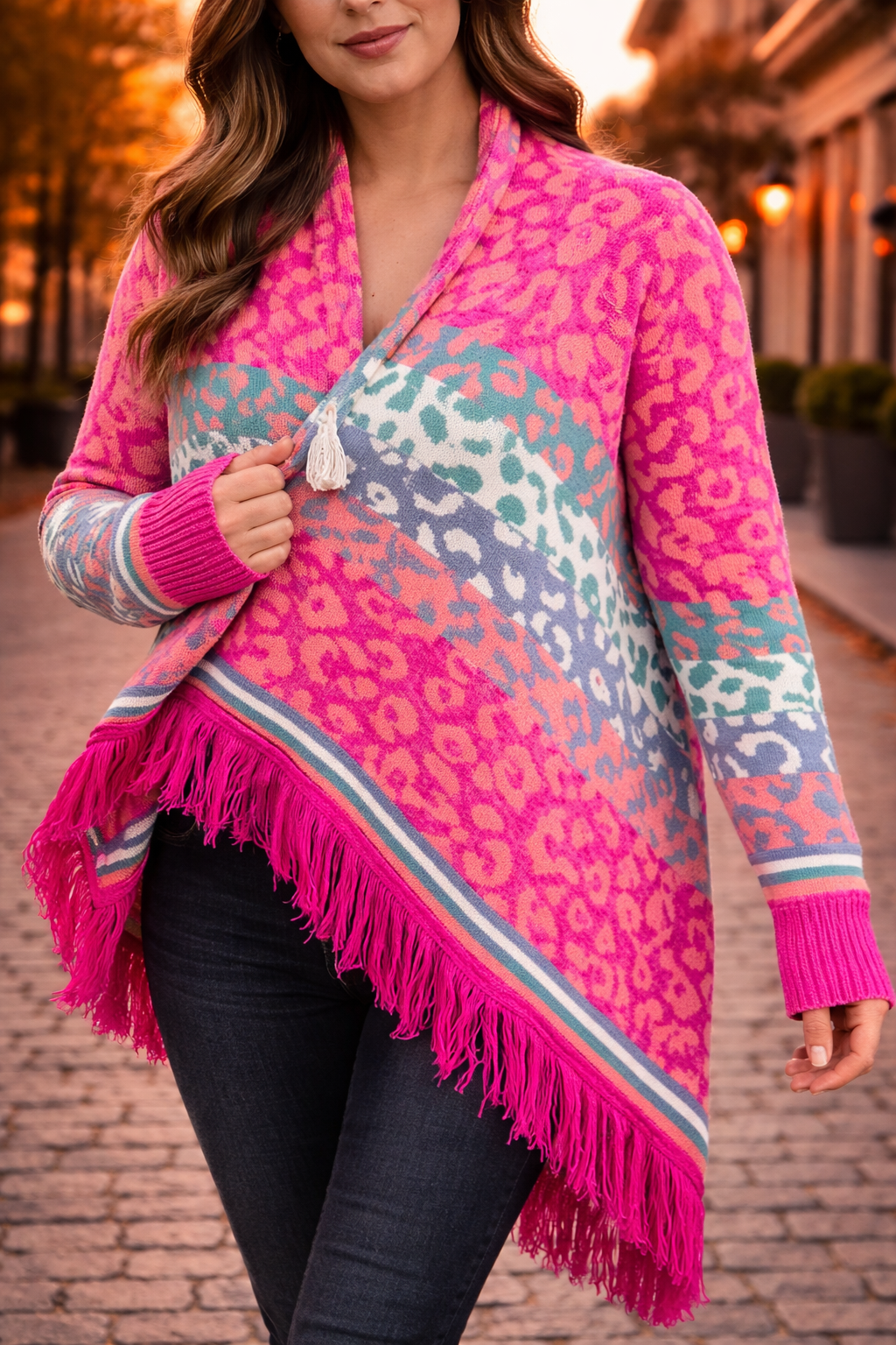 Sumale color y personalidad a tus looks con estos ponchos tejidos de diseño único. Con estampado tipo animal print en tonos vibrantes, combinan a la perfección estilo y comodidad.