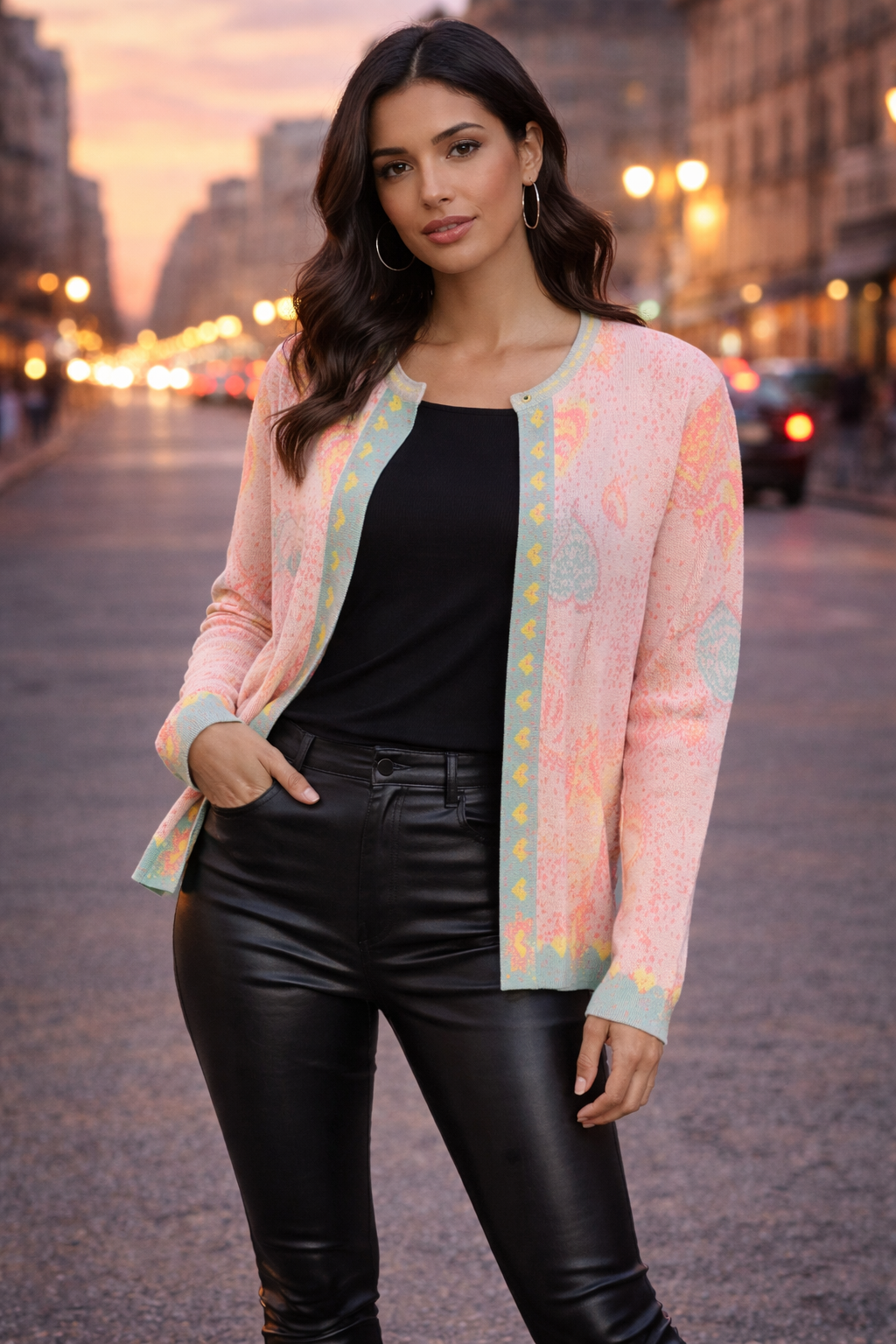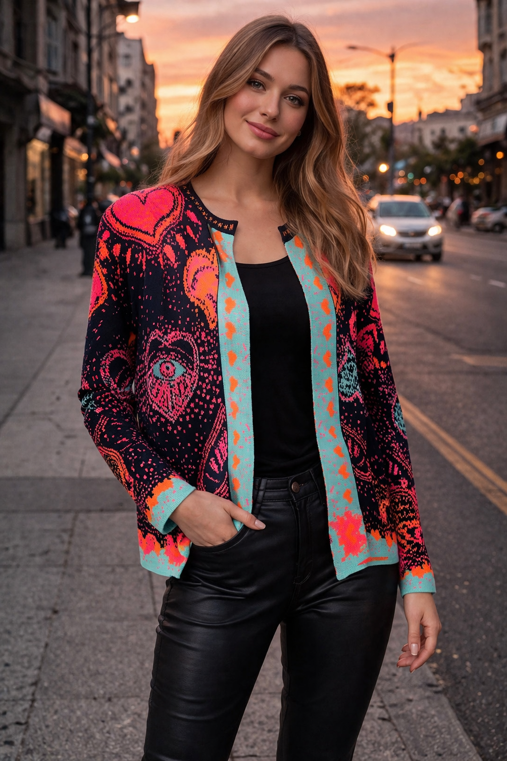 Saco tejido de calce cómodo con diseño en tonos vibrantes. Ideal para sumar un toque canchero y original a cualquier look.