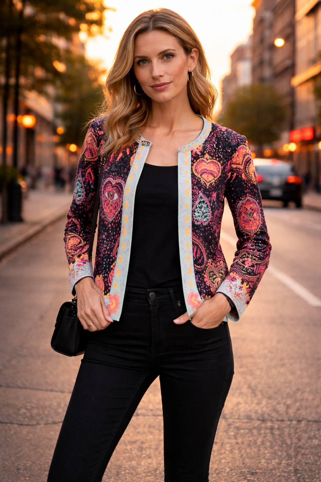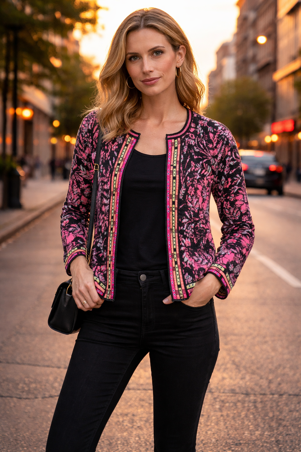 Saco tejido de calce cómodo con diseño en tonos vibrantes. Ideal para sumar un toque canchero y original a cualquier look.